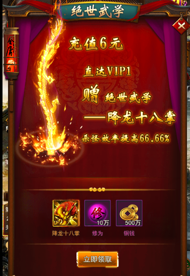 1、 首充:想做大侠,没有绝世神功怎么可以,现在只要充值6块就能获得绝世神功“降龙十八掌”。
